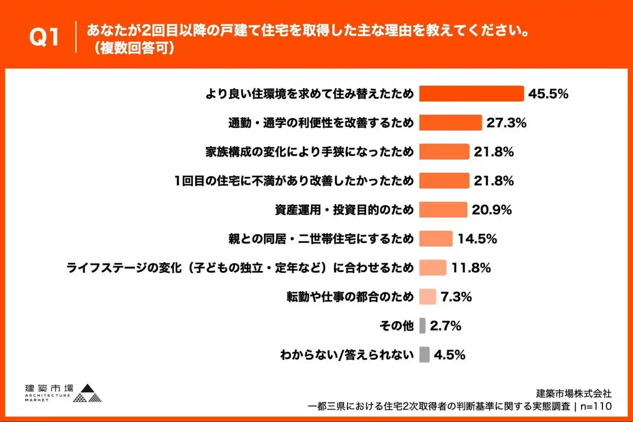 「Q1. あなたが2回目以降の戸建て住宅を取得した主な理由を教えてください。(複数回答可)」(n=110)と質問したところ、「より良い住環境を求めて住み替えたため」が45.5%、「通勤・通学の利便性を改善するため」が27.3%という回答となりました。 |