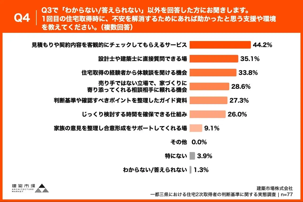 「Q4. Q3で「わからない/答えられない」以外を回答した方にお聞きします。1回目の住宅取得時に、不安を解消するためにあれば助かったと思う支援や環境を教えてください。(複数回答)」(n=77)と質問したところ、「見積もりや契約内容を客観的にチェックしてもらえるサービス」が44.2%、「設計士や建築士に直接質問できる場」が35.1%、「住宅取得の経験者から体験談を聞ける機会」が33.8%という回答となりました。 |