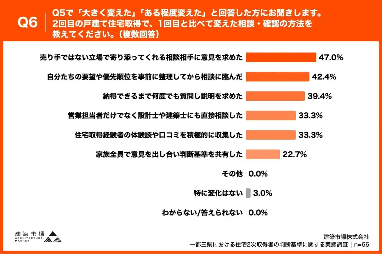 「Q6. Q5で「大きく変えた」「ある程度変えた」と回答した方にお聞きします。2回目の戸建て住宅取得で、1回目と比べて変えた相談・確認の方法を教えてください。(複数回答)」(n=66)と質問したところ、「売り手ではない立場で寄り添ってくれる相談相手に意見を求めた」が47.0%、「自分たちの要望や優先順位を事前に整理してから相談に臨んだ」が42.4%、「納得できるまで何度でも質問し説明を求めた」が39.4%という回答となりました。 |