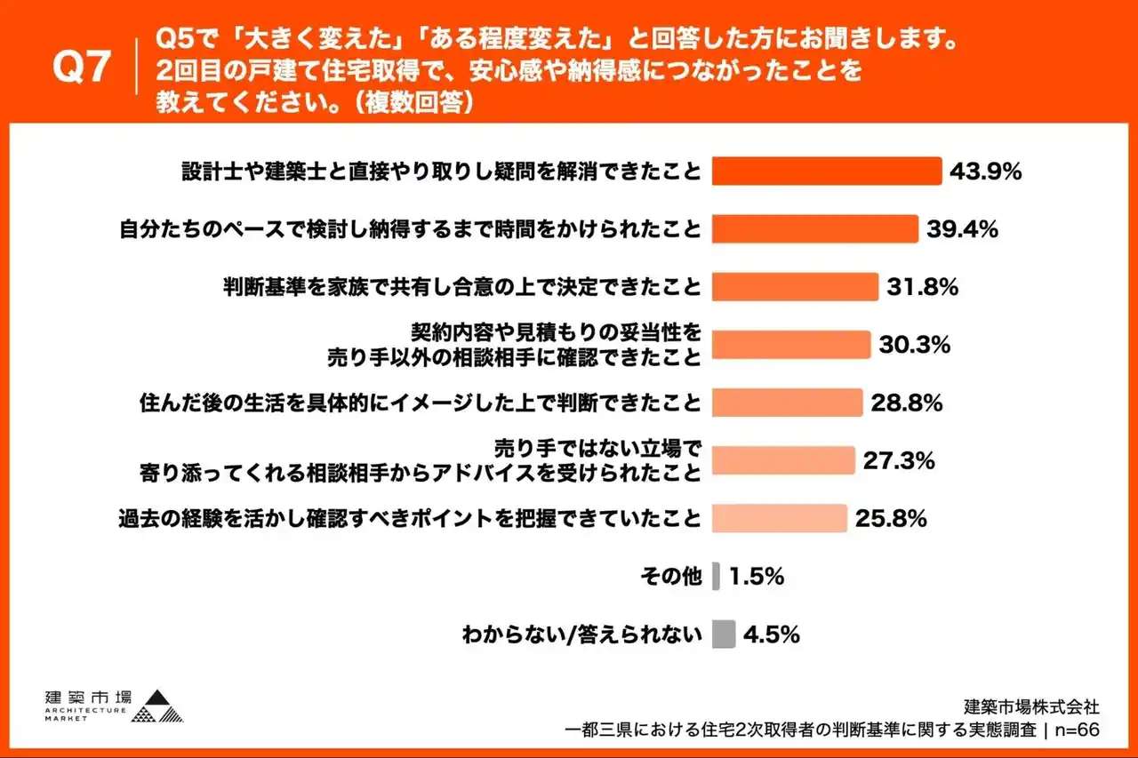 「Q7. Q5で「大きく変えた」「ある程度変えた」と回答した方にお聞きします。2回目の戸建て住宅取得で、安心感や納得感につながったことを教えてください。(複数回答)」(n=66)と質問したところ、「設計士や建築士と直接やり取りし疑問を解消できたこと」が43.9%、「自分たちのペースで検討し納得するまで時間をかけられたこと」が39.4%、「判断基準を家族で共有し合意の上で決定できたこと」が31.8%という回答となりました。 |