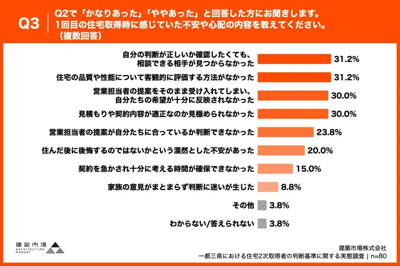 「Q3. Q2で「かなりあった」「ややあった」と回答した方にお聞きします。1回目の住宅取得時に感じていた不安や心配の内容を教えてください。(複数回答)」(n=80)と質問したところ、「自分の判断が正しいか確認したくても、相談できる相手が見つからなかった」が31.2%、「住宅の品質や性能について客観的に評価する方法がなかった」が31.2%という回答となりました。 |