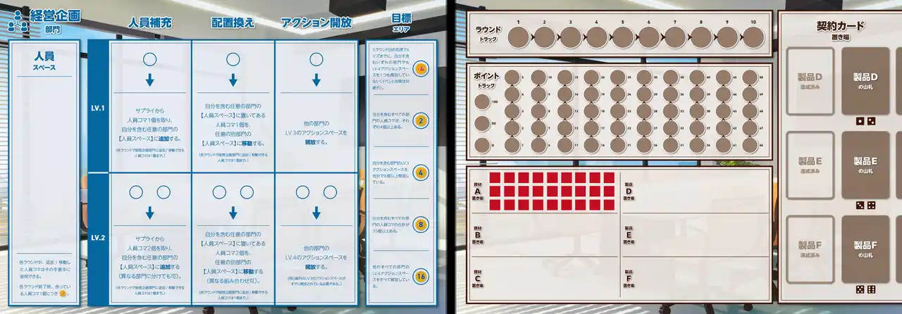 | 各部門にはそれぞれ異なる目標が設定されています。また、突発的な需要変動や供給トラブルなどのイベントも発生します。プレイヤーは自部門の成果を最大化しながらも、発生するイベントに対処しつつチーム全体としてのスコア最大化を目指さなければなりません。 | |||