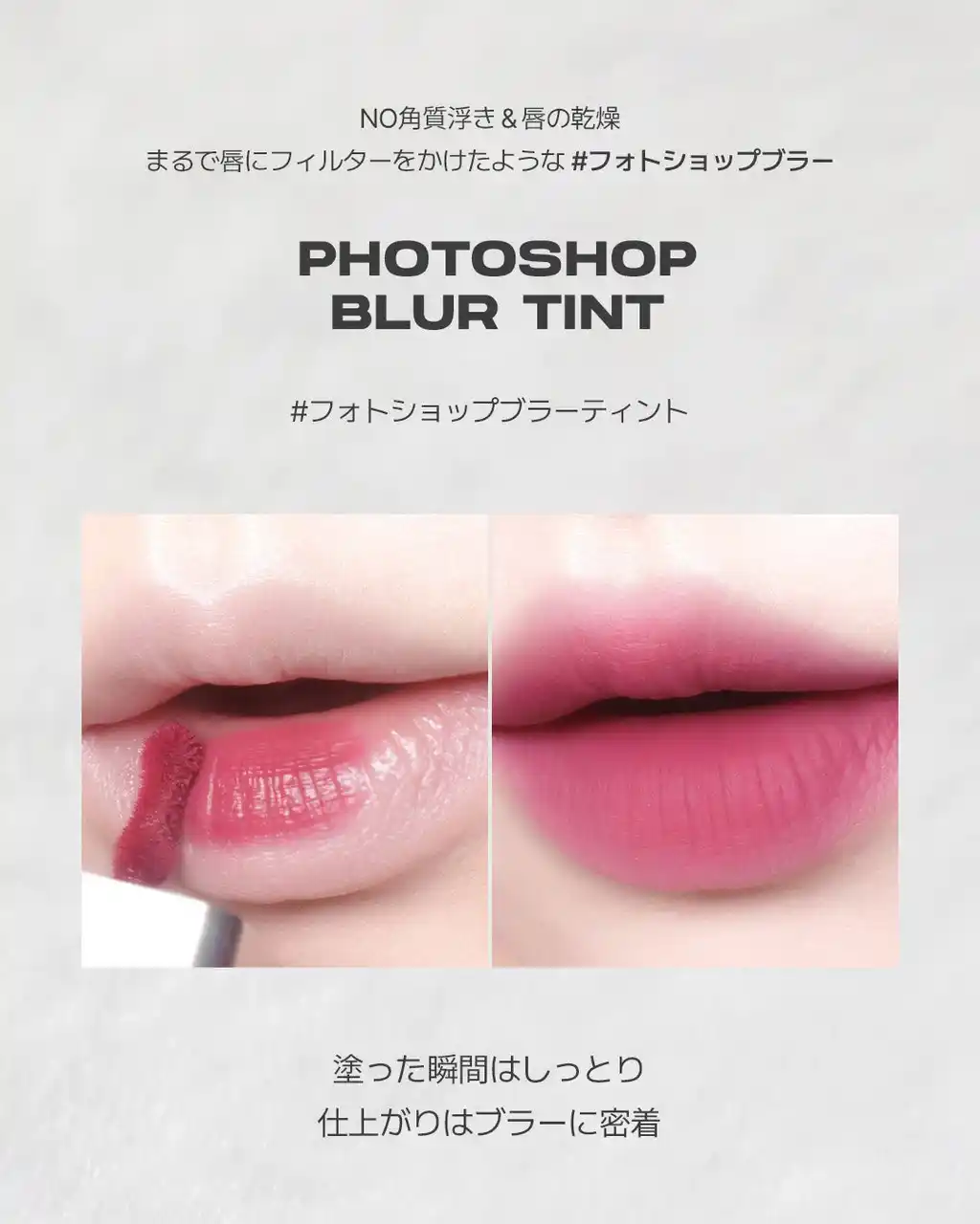 「ブラーフィットティントミニ」は、自然にブラー質感へと変化する構造が特徴で、乾燥した唇の上でもシワの隙間をなめらかに埋め、唇のコンディションに左右されず均一な仕上がりを実現します。 |