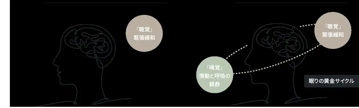 音源とアロマが完璧に調和することで、聴覚と嗅覚から多感覚的に働きかけ、単体で使用するよりも強力な入眠誘導効果を発揮します。聴覚は脳の緊張を緩め、副交感神経を優位にするリズムづくりを担い、嗅覚は大脳辺縁系へ直接作用して情動と呼吸を落ち着かせるため、心身が同時に「休息モード」へと切り替わりやすくなるこの相乗効果こそが深い眠りへ導く鍵です。 |