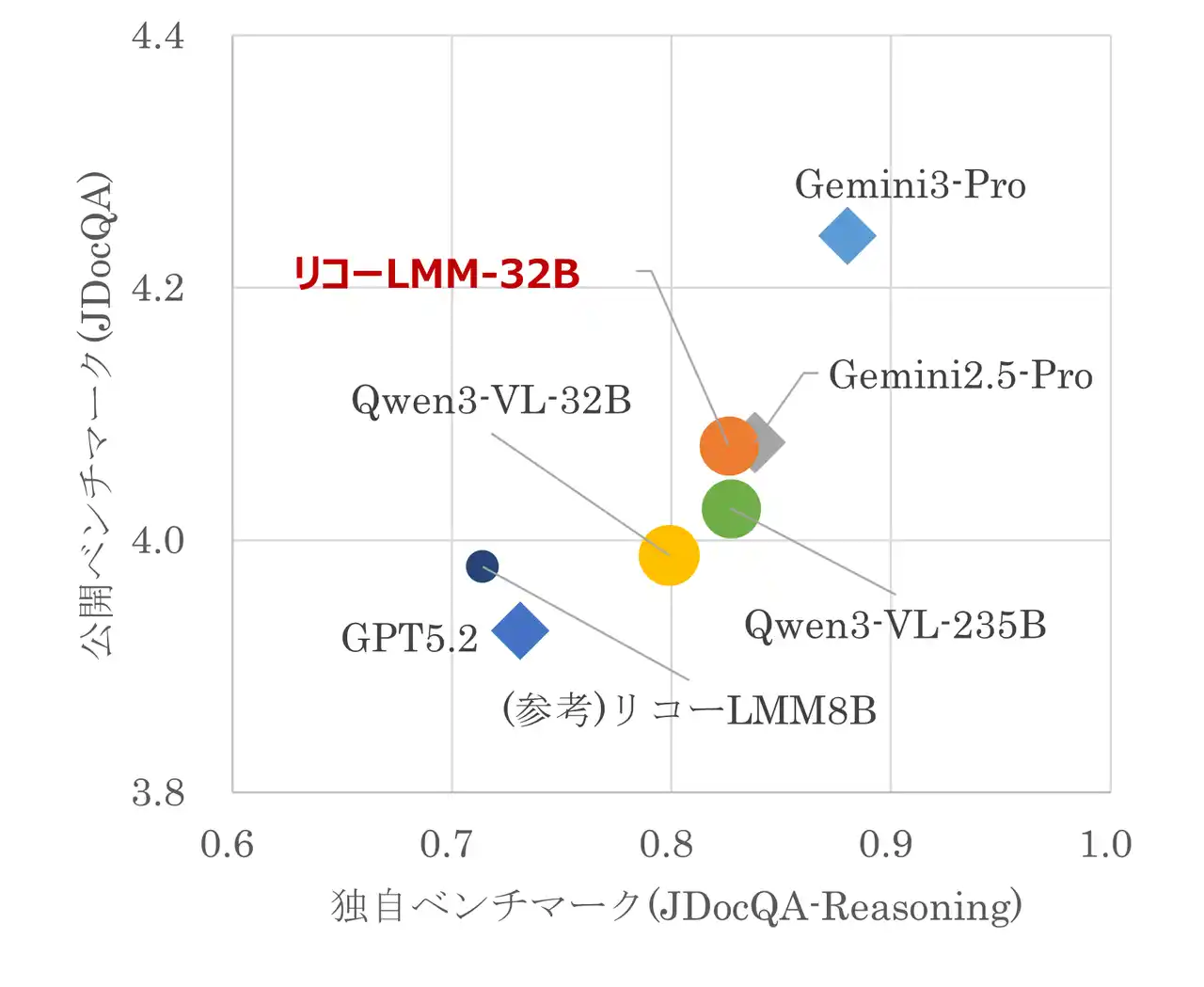 | 株式会社リコー(社長執行役員:大山 晃)は、経済産業省と国立研究開発法人新エネルギー・産業技術総合開発機構(NEDO)が実施する、国内における生成AIの開発力強化を目的としたプロジェクト「GENIAC(Generative AI Accelerator Challenge)*1」第3期において、図表を含む多様なドキュメントを、高精度に読み取ることができる、リーズニング性能*2を備えたマルチモーダル大規模言語モデル(以下、リーズニングLMM)の基本モデル「Qwen3-VL-Ricoh-32B-20260227」の開発を完了したことをお知らせします。本モデルは、多段推論を通じて複雑なドキュメントを理解できる点が特徴です。 | |||||||||