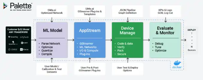 「Palette」や「Palette Edgematic」ソフトウェアの開発環境は、エッジAIを高速かつ直感的に操作を行えます。一方、Modalix SoM製品とMoalix SOM製品が搭載された開発キットが、ビジョン、言語、制御といった分野における現実世界のマルチモーダルAIパイプラインをサポートします。 |