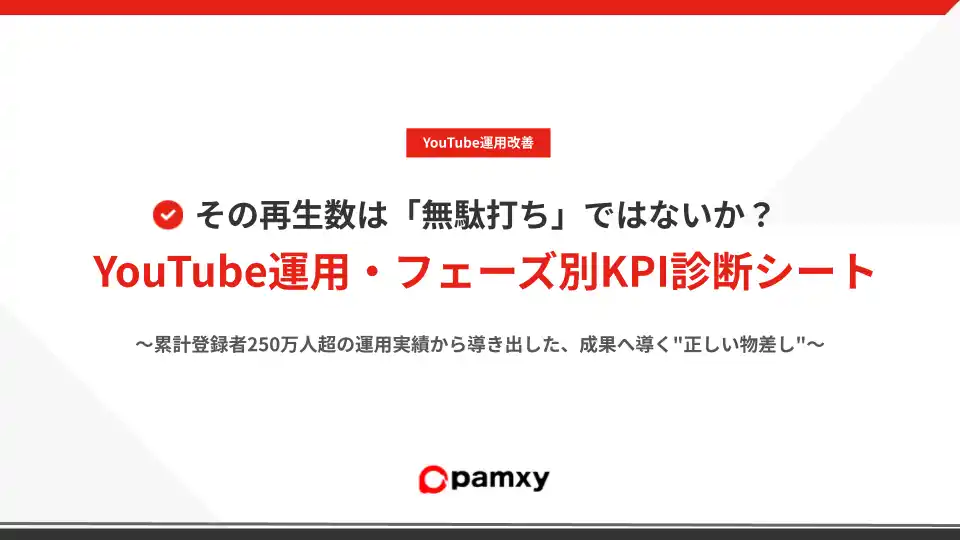 SNSマーケティング支援事業を展開する株式会社pamxy(本社:東京都港区、代表取締役:西江 健司)は、企業のYouTube運用における投資対効果(ROI)を最大化するため、独自の診断資料『YouTubeフェーズ別・KPI診断シート(PDF版)』本日公開いたしました。 |