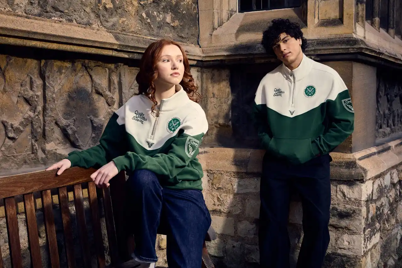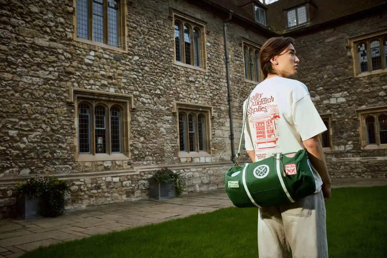 「高級クィディッチ用具店」をテーマにしたグッズが登場。店頭に並ぶアイテムをイメージした、スポーティーでありながらレトロなデザインのアイテムがラインナップ。試合ユニフォームからインスピレーションを得たTシャツやスウェット、ソックスなど、アスレジャー感あふれるアパレルをはじめ、「スニッチ」や「ニンバス2000」といった象徴的なモチーフをあしらったマグやアクセサリーなどの雑貨も充実。
