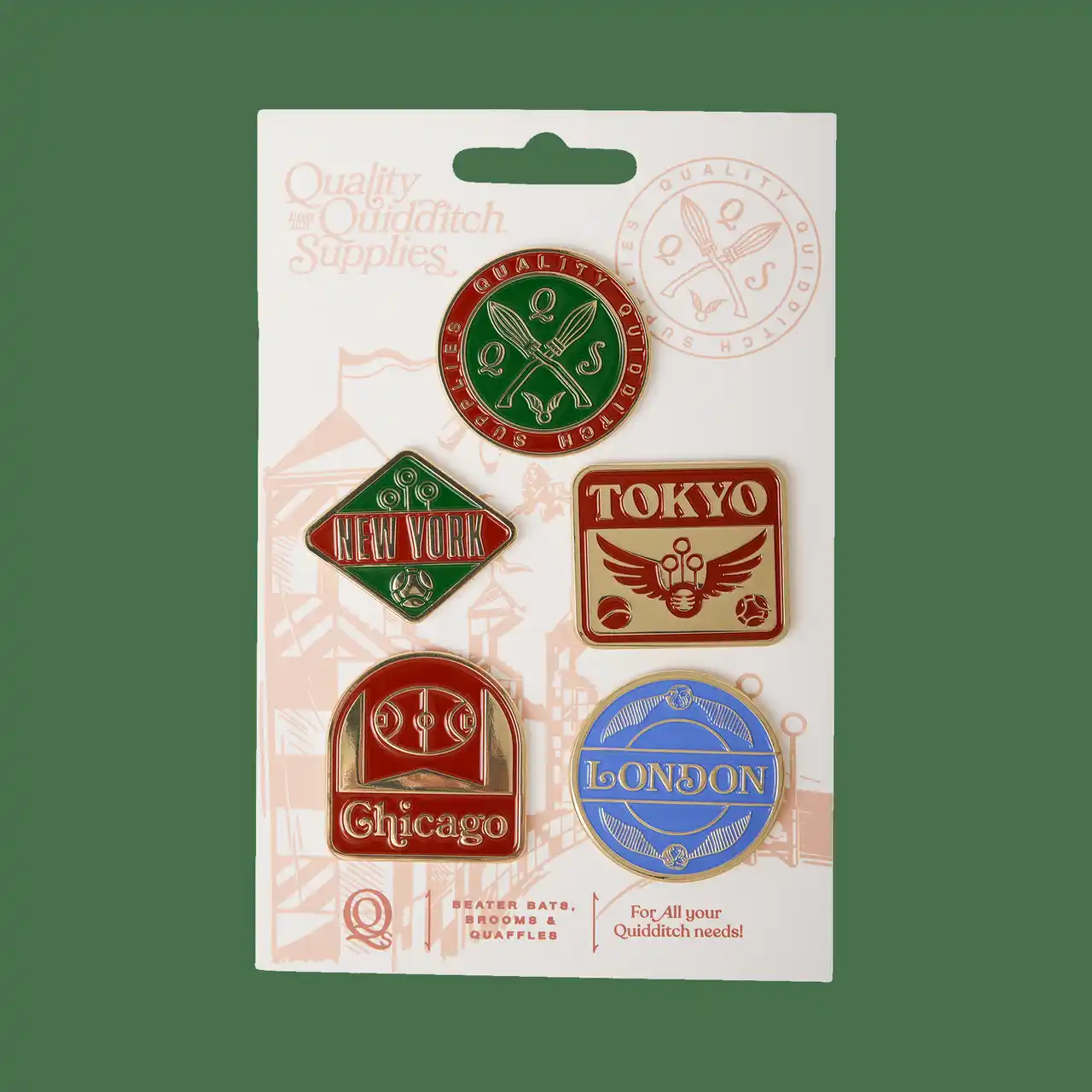 ロンドン、ニューヨーク、東京、シカゴなど、クィディッチの拠点をモチーフにしたロケーションマグネットセット。「高級クィディッチ用具店」のエッセンスを取り入れた、パッチ風デザインが特徴です。鮮やかなカラーと立体的な仕上がりで、本物のチームバッチのような存在感を再現しました。 |