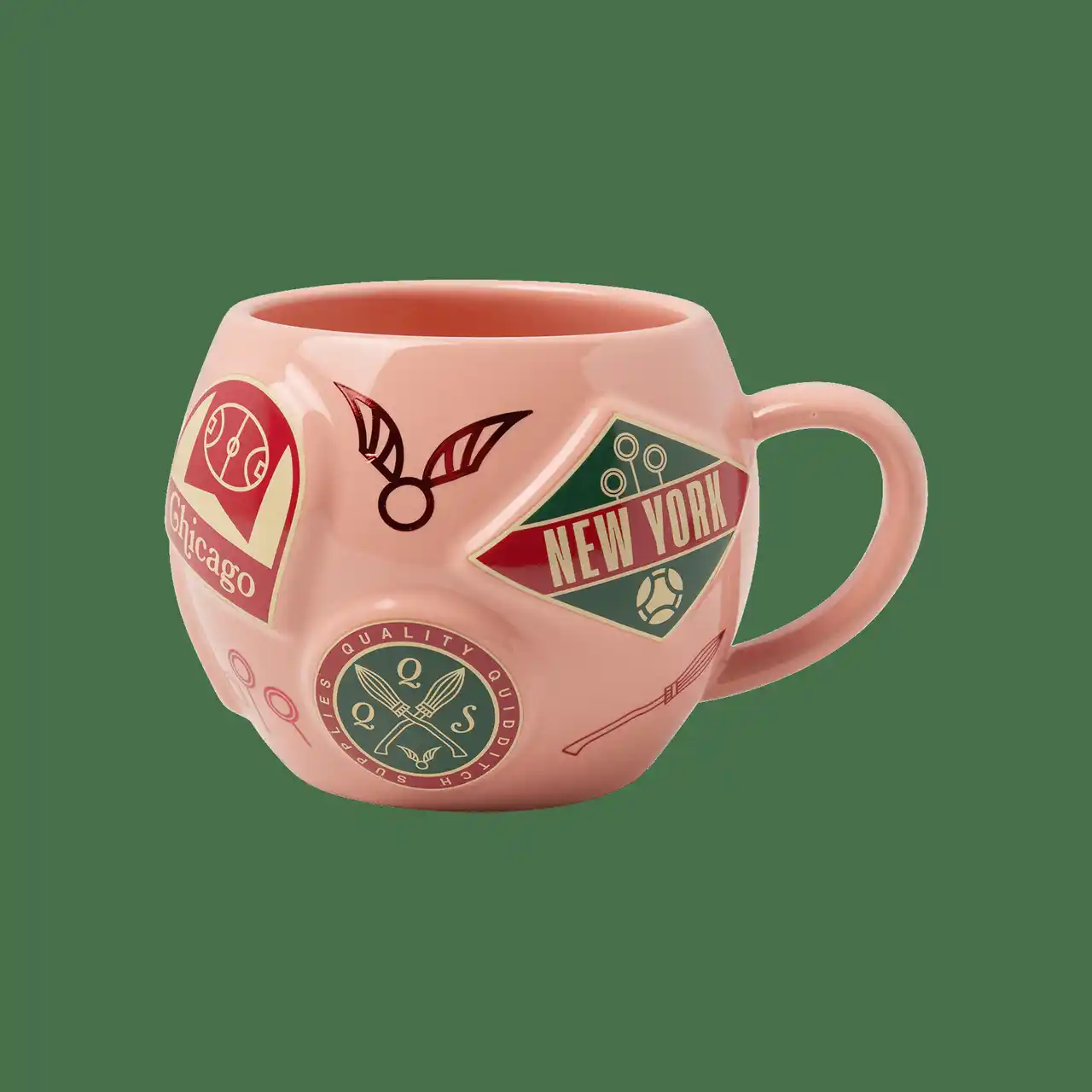 やわらかなピンクのカラーと丸みのあるフォルムに、ロンドン、ニューヨーク、東京、シカゴなど、世界のクィディッチの拠点を表現した立体バッジをあしらいました。それぞれの地域ごとのデザインと、クィディッチのシンボルやニンバス2000のモチーフを取り入れ、重なり合うディテールが、各地の記念品のような存在感の一品です。 |