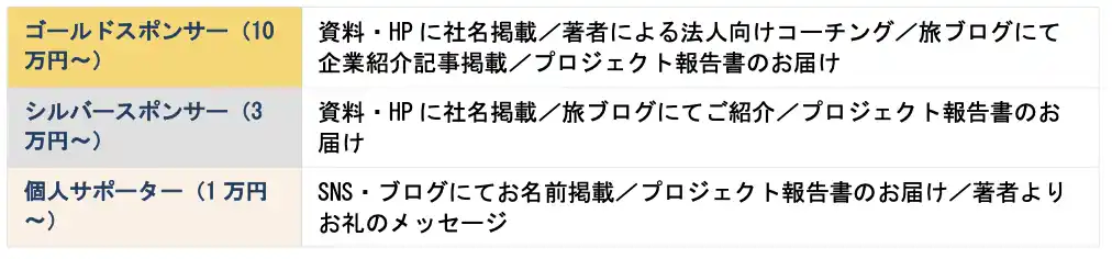 クラウドファンディング(CAMPFIRE)にて180万円を達成しており、そのうち活動費に当てられるのは70万円。 |