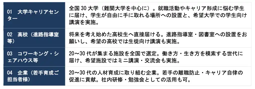 ● 高校・大学・コワーキングスペース・企業など全国100施設を訪問し、3,000名へ書籍献本と講演を無償で届ける |