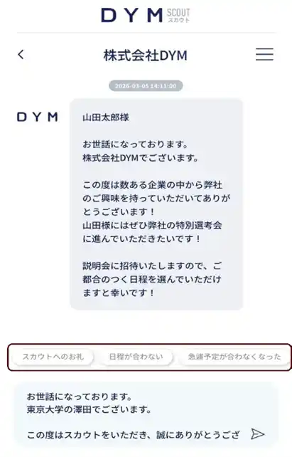 | 「DYMスカウト」は、企業からの直接スカウトを受け取れる就活アプリです。 | |||