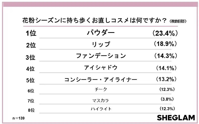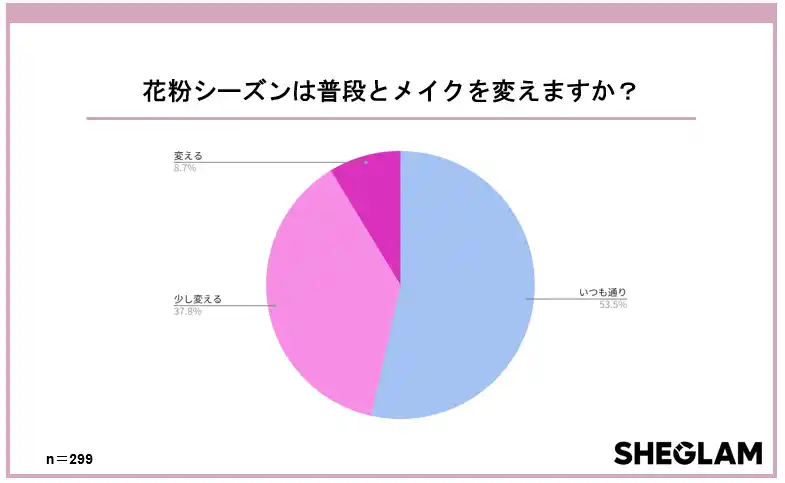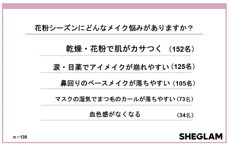 150以上の国と地域で展開するグローバルコスメブランド「SHEGLAM」は、10~30代の女性299人を対象に、「花粉シーズンのメイク意識調査」を実施しました。 |