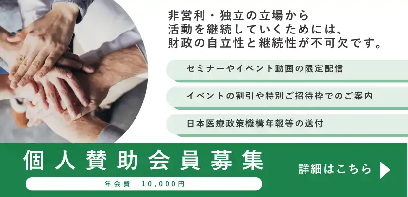 Institute)は、2004年に設立された非営利、独立、超党派の民間の医療政策シンクタンクです。市民主体の医療政策を実現すべく、独立したシンクタンクとして、幅広いステークホルダーを結集し、社会に政策の選択肢を提供してきました。特定の政党、団体の立場にとらわれず、独立性を堅持し、フェアで健やかな社会を実現するために、将来を見据えた幅広い観点から、新しいアイデアや価値観を提供しています。