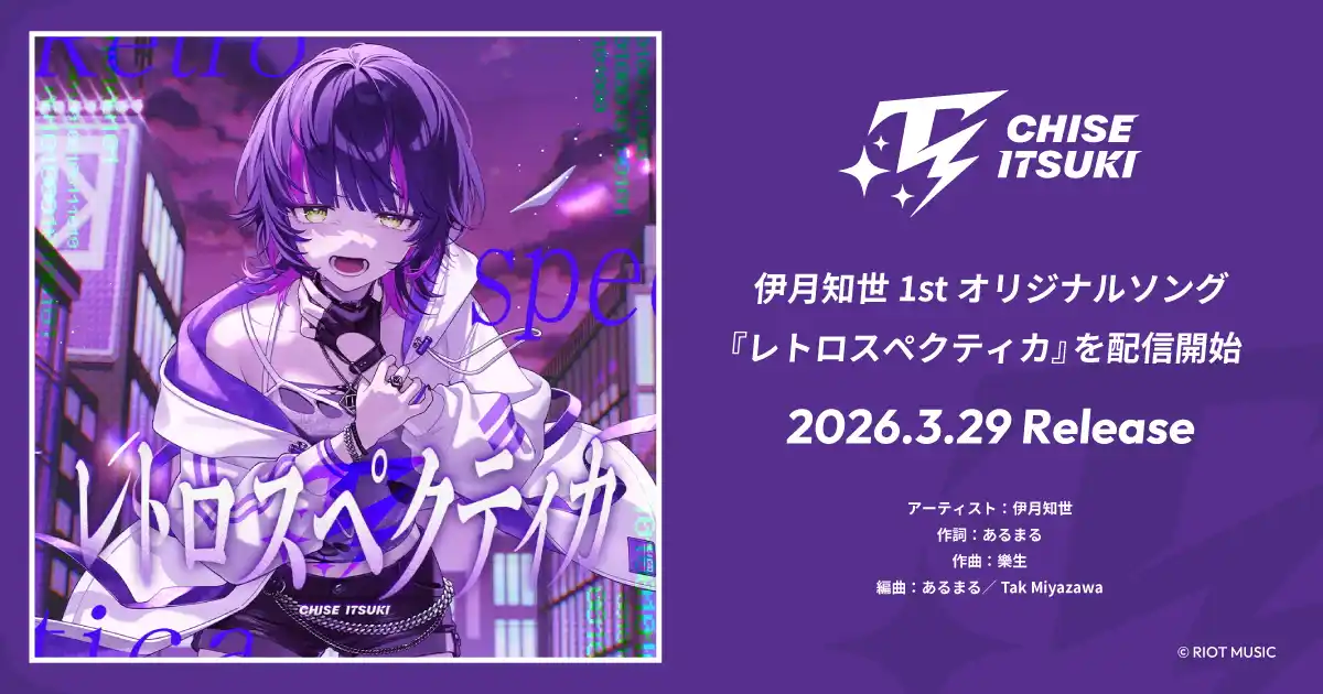| 株式会社RIOT MUSIC(本社:東京都港区、代表取締役:舩橋 純、読み:ライオットミュージック、以下「RIOT MUSIC」)は、同社が運営するVSingerレーベル「無原唱レコード」所属のバーチャルアーティスト「伊月知世(いつき ちせ)」による1stオリジナルソング『レトロスペクティカ』を2026年3月29日(日)に各種配信サービスにて配信開始しました。あわせて、イラストレーター・noka氏による描き下ろしイラストを使用した誕生日グッズの販売も開始しています。 | |||||||||||