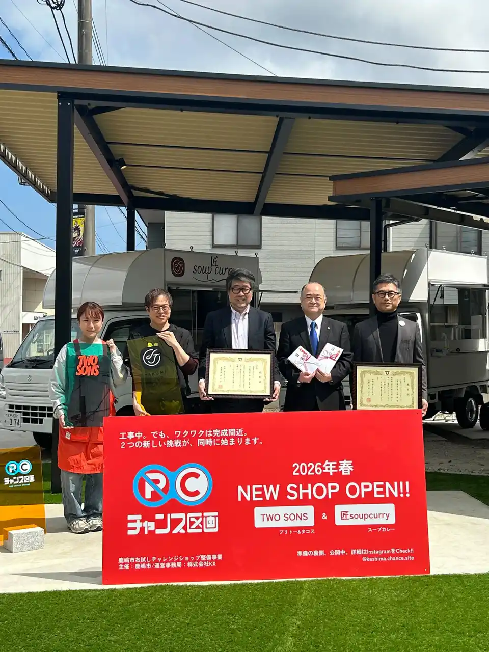 株式会社カクイチ(代表取締役社長:田中 離有)は、企業版ふるさと納税を通じた地域貢献の一環として、茨城県鹿嶋市が推進するキッチンカー型チャレンジショップ事業「チャンス区画」に、物納制度を通じてガレージ製品を寄贈しました。2026年3月28日(土)、鹿嶋市内にて引渡しセレモニーが執り行われ、入居者への鍵の受け渡しが行われました。 |