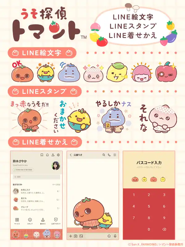 | 「うそ探偵トマント」は、サンエックス株式会社と株式会社ファンワークスが共同で手掛けるキャラクターIPです。やさいやくだものをモチーフとしたユニークな個性豊かなキャラクターたちが登場する、かわいらしさと本格ミステリー要素を掛け合わせた作品で、幅広い世代にお楽しみいただける“かわいい×ミステリー”の新ジャンル作品です。 | |||
