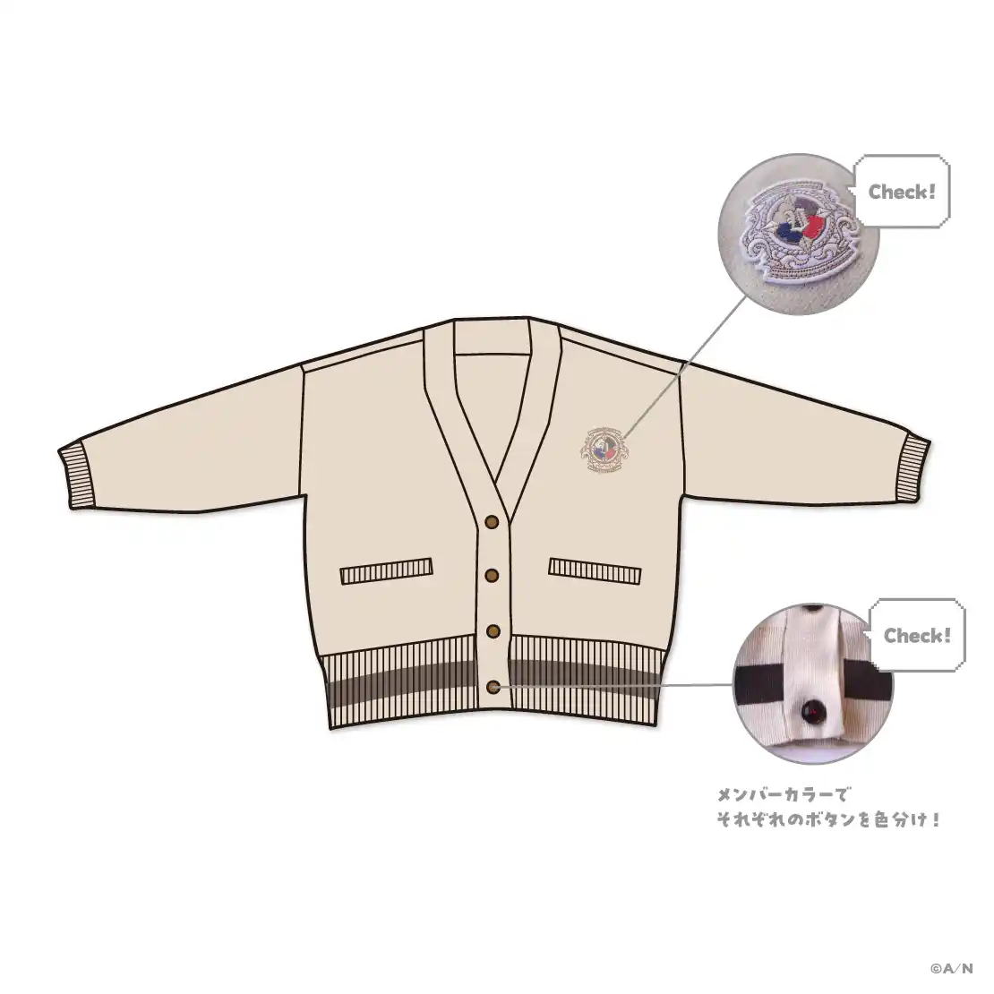 グッズラインナップは、ランダムフォト風カード、ボイスアクリルスタンド、ランダム箔押し缶バッジ、セーラーマスコット、アクリルブロック、好感度??アクリルキーホルダー、ヘアクリップセット、ハンサム付箋ブック、コレクトブック、生徒手帳風ノート&ボールペンセット、カーディガン、ダイカットアクリルパネルの全12種類。 |