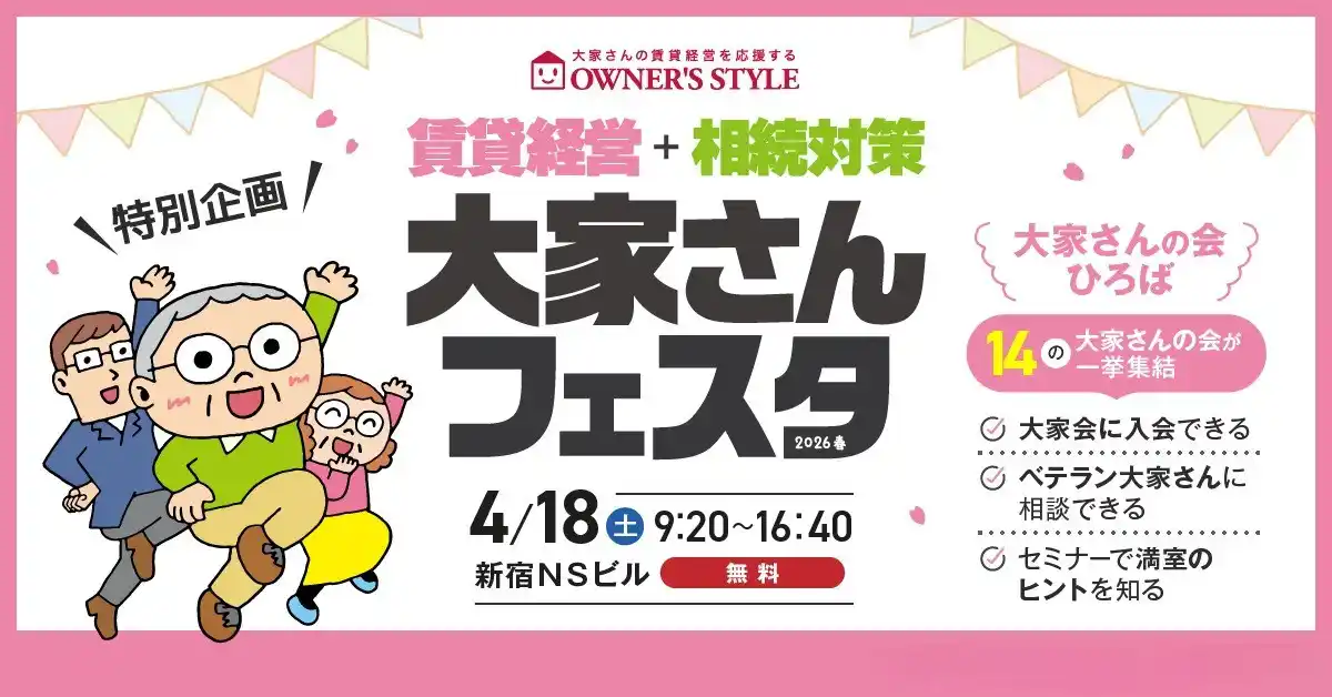 【日時】2026年4月18日(土) 9:20 ~17:40(16:40受付終了) 【会場】新宿NSビルB1階イベントホール(新宿区西新宿2-4-1) 【入場料】無料 ※下記の来場予約フォームより、事前登録をお願いいたします。 URL:https://owners-style.net/s/festa/?top=panel 【主催】株式会社オーナーズ・スタイル |