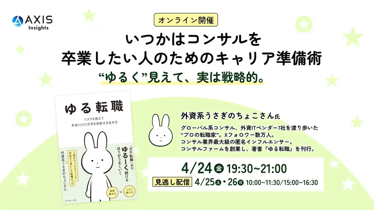 「あらゆる課題は、人で解決する。」をコーポレートステートメントとするアクシスコンサルティング株式会社(本社:東京都千代田区/代表取締役社長 COO:伊藤 文隆)は、書籍「ゆる転職 リスクを抑えて年収1000万円を目指せる生き方」の著者であり、数万人のフォロワーを擁するコンサル業界のインフルエンサー 外資系うさぎのちょこさん氏をお迎えし、ウェビナー「いつかはコンサルを卒業したい人のためのキャリア準備術 “ゆるく”見えて、実は戦略的」を開催いたします。 |