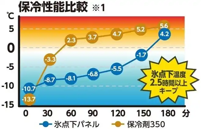 ※1 家庭用冷凍庫で24時間以上冷凍した保冷剤をクーラーボックスに入れ、40℃の環境下に放置し、保冷剤の表面温度を30分毎に測定した結果。 |
