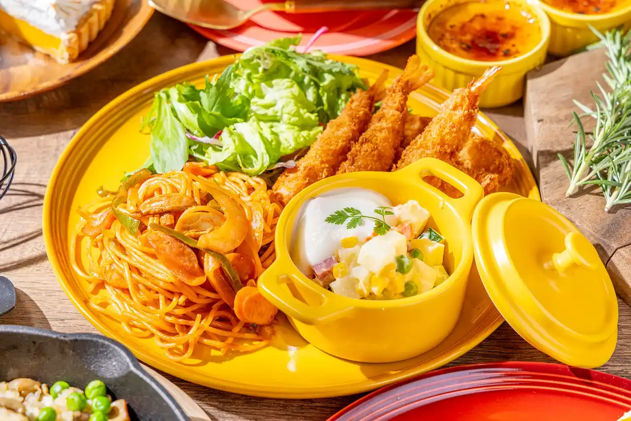 左から、特製 ナポリタンパスタ、揚げたてエビフライ、王道ポテトサラダのエスプーマ仕立て |