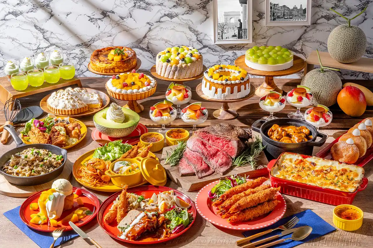 デザートには、旬のメロンとマンゴーを取り入れたスイーツが並びます。清涼感あふれる「メロンのレアチーズケーキ」やクランブルとホイップを重ねた三層仕立ての「メロンババロア」、プリンにメロンをトッピングした「プリン・ア・ラ・モード」のほか、北海道ミルクをたっぷり含ませた「マンゴーフレンチトースト」や「マンゴーのメレンゲパイ」などが、ビュッフェ台を彩ります。 |