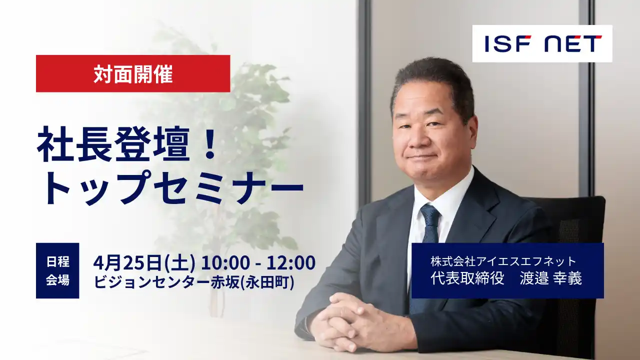 株式会社アイエスエフネット(本社:東京都港区/代表取締役:渡邉幸義、以下アイエスエフネット)は、2026年4月25日(土)にビジョンセンター赤坂(永田町)にて、27年卒向け「社長登壇!トップセミナー」を開催します。当日は代表の渡邉が登壇し、就職活動中の学生に、アイエスエフネットの魅力を直接お伝えします。 |