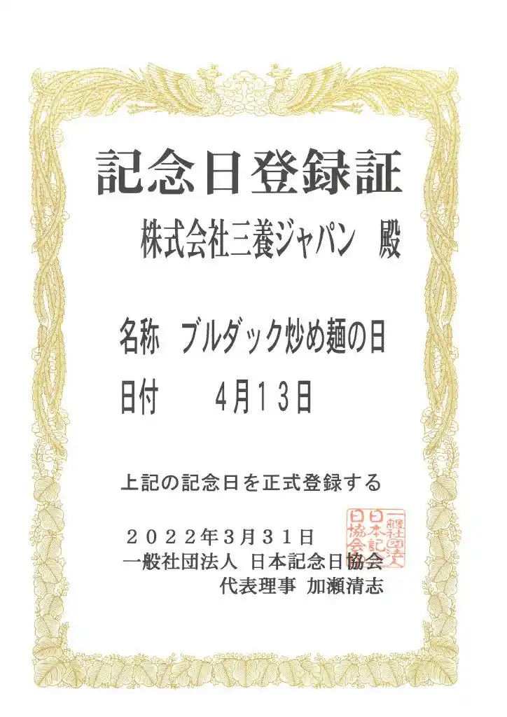 株式会社三養ジャパンは「ブルダック炒め麺」の美味しさと魅力を多くの方に知っていただくとともに、ブルダック炒め麺公式キャラクターのホチの誕生日でもある4月13日を皆様と共にお祝いしたいと考え、一般社団法人日本記念日協会より記念日の認定を受けました。 |