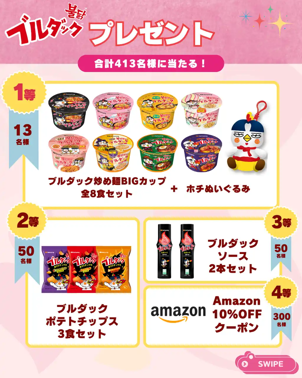 本キャンペーンでは、SNSを通じてブルダックブランドの魅力を体験できる企画を展開します。抽選でブルダック炒め麺詰め合わせセットや限定ノベルティの他、ECショップクーポンが当たるなどブルダック商品をお得に購入できる機会を提供します。 |