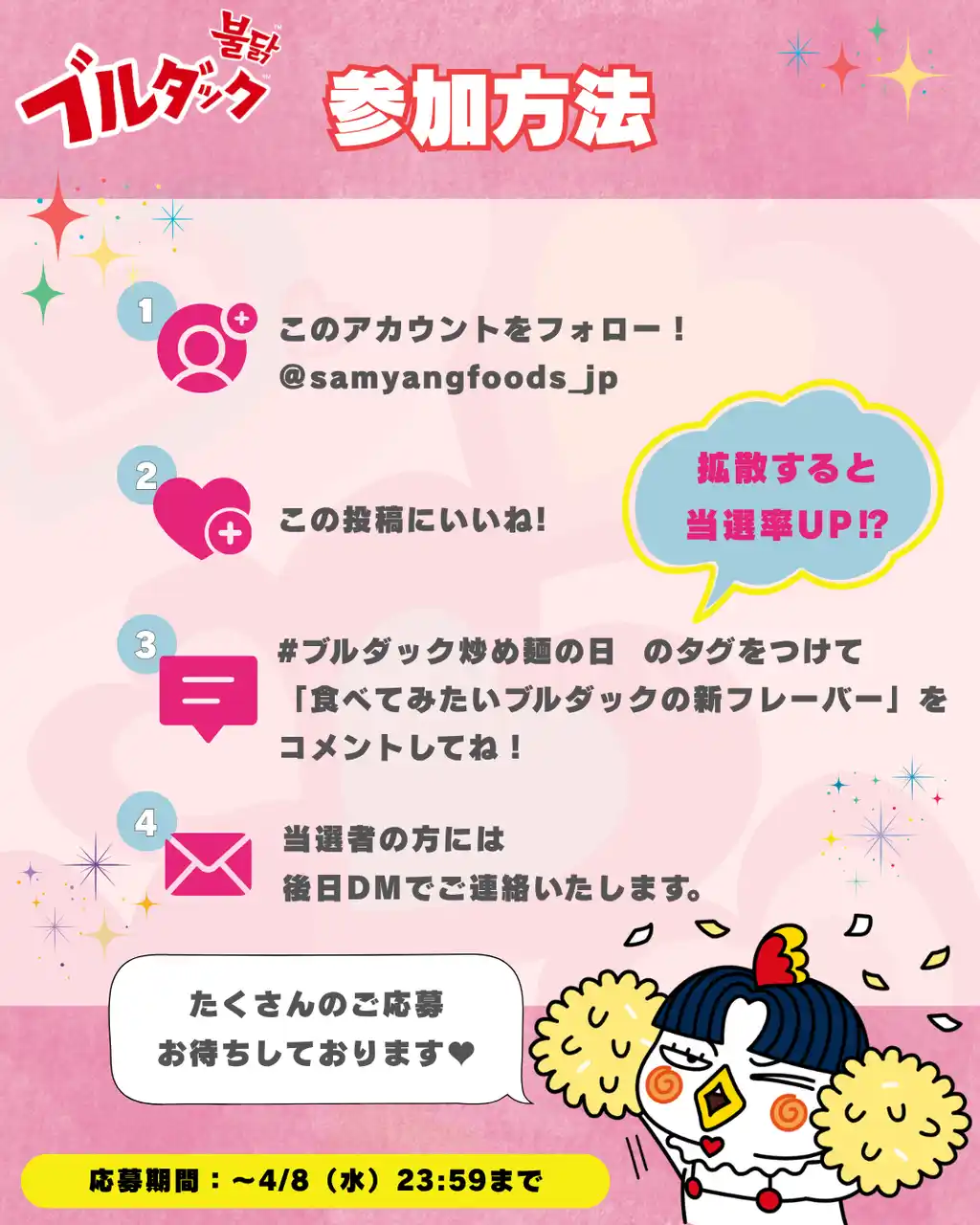 株式会社三養ジャパン(本社:東京都千代田区)は、4月13日の「ブルダック炒め麺の日」を記念し、2026年4月1日(水)18時よりSNSキャンペーンを開催いたします。本キャンペーンでは、InstagramおよびX(旧Twitter)にて参加型イベントを実施し、抽選で合計413名様にブルダック商品やクーポンをプレゼントいたします。 |