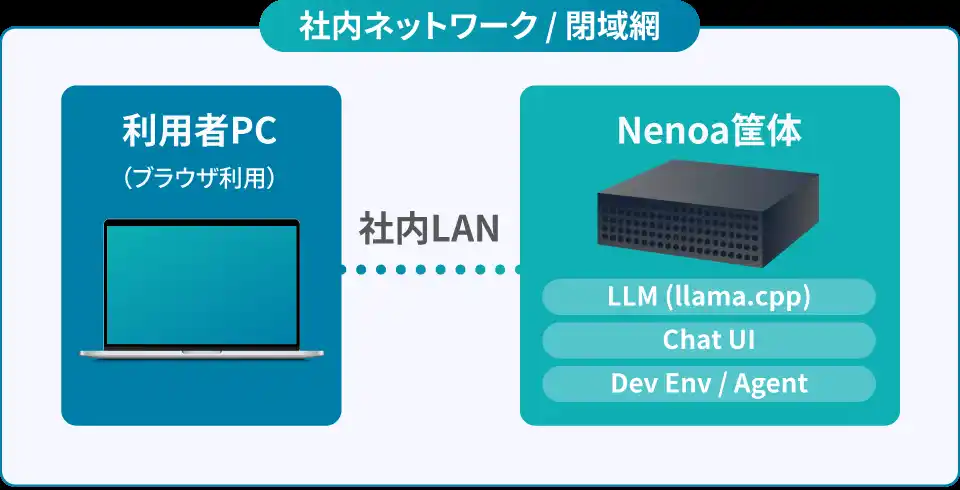 「Nenoa」の最大の差別化要素は「データが社内ネットワーク外に出る経路が存在しない」設計です。物理的・構造的にデータ漏洩が起こり得ない仕組みを実現しており、入力データはAIモデルの学習にも使用されません。 |