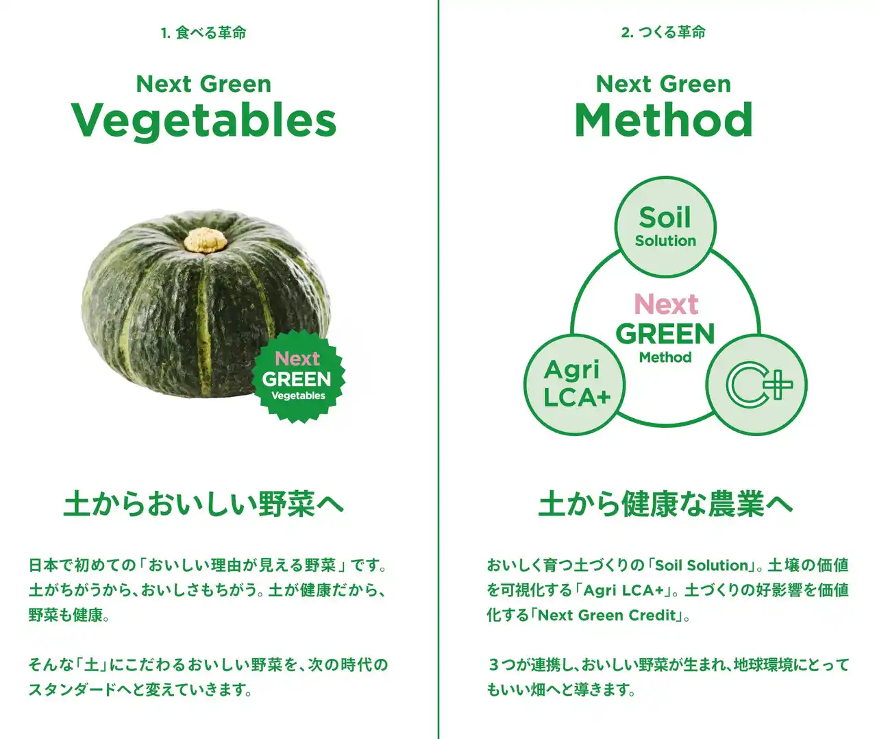土づくりによって育った野菜の価値を届ける「Next Green Vegetables」と、土壌環境の改善や環境価値の評価を行う仕組みである「Next Green Method」 の2つの取り組みから構成されています。環境クレジット「Next Green Credit」は「Next Green Method」において環境価値循環の役割を担い、有機発酵資材「Soil Next」の活用を始めとした土づくりの活動を経済的に支えます。 |
