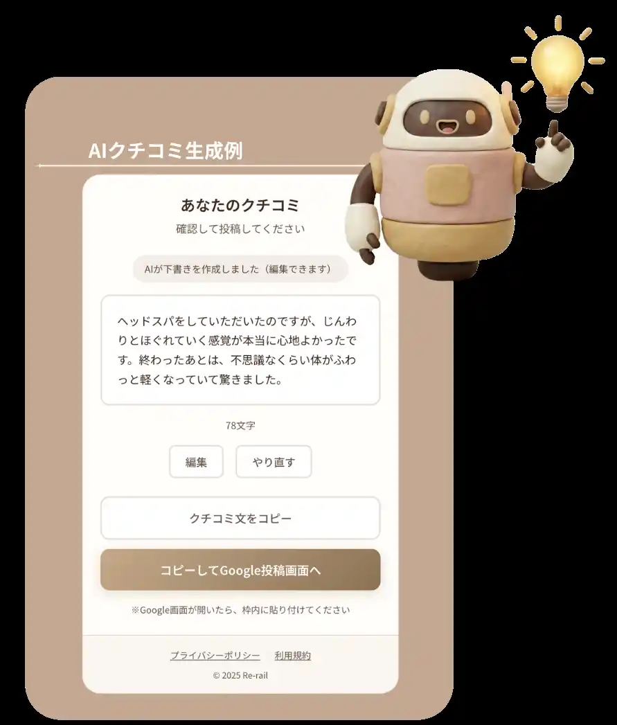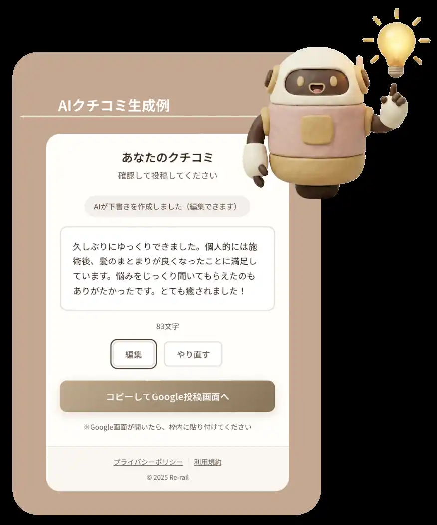 選択式が中心のため、お客様は文章を考えられないとしても問題なく生成可能。アプリのダウンロードも不要で、その場ですぐにご利用いただけます。生成されたクチコミ文は編集・再生成も可能で、納得のいく内容をお客様ご自身の意思で投稿していただく仕組みです。 |