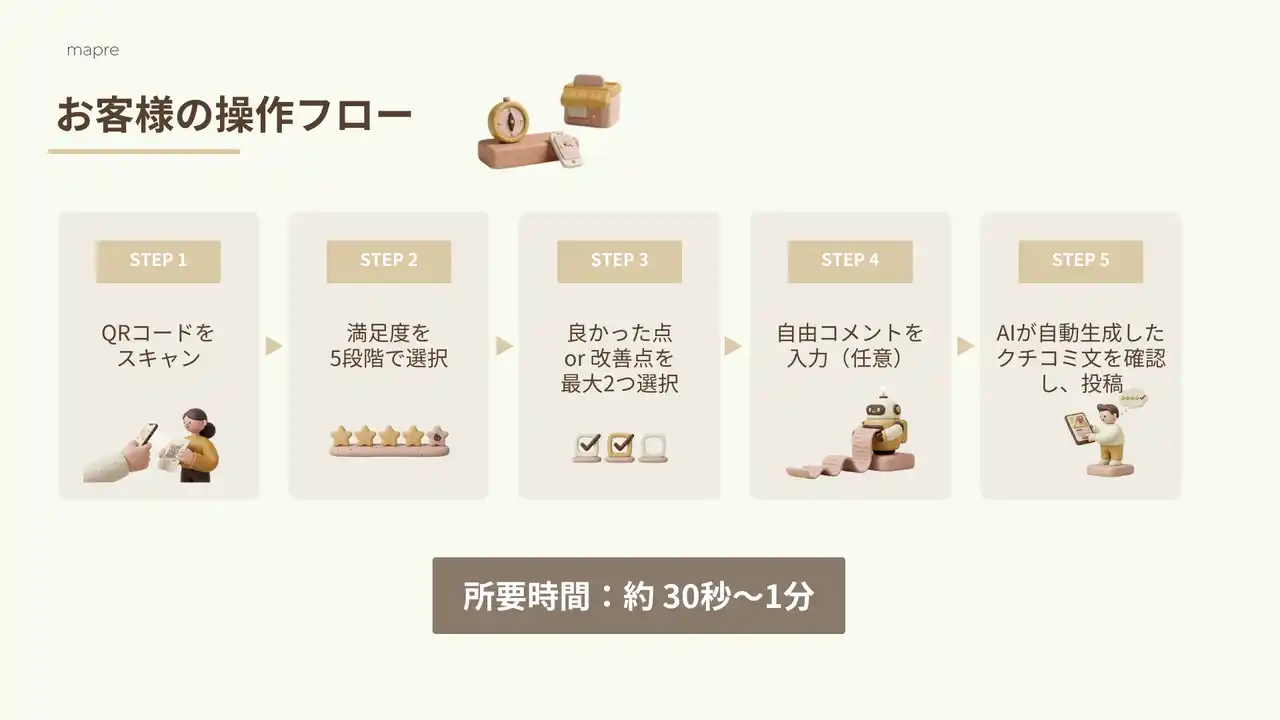 mapreは、来店されたお客様がQRコードを読み込み約1分の簡単なアンケートに回答するだけで、AIが業種や店舗の特性に合わせた自然なクチコミ文を自動生成するサービスです。「クチコミを書きたいけど何を書けばいいかわからない」というお客様の負担と、「クチコミをお願いしづらい」という店舗スタッフ様の悩みを同時に解消し、店舗の集客力向上を支援します。 |