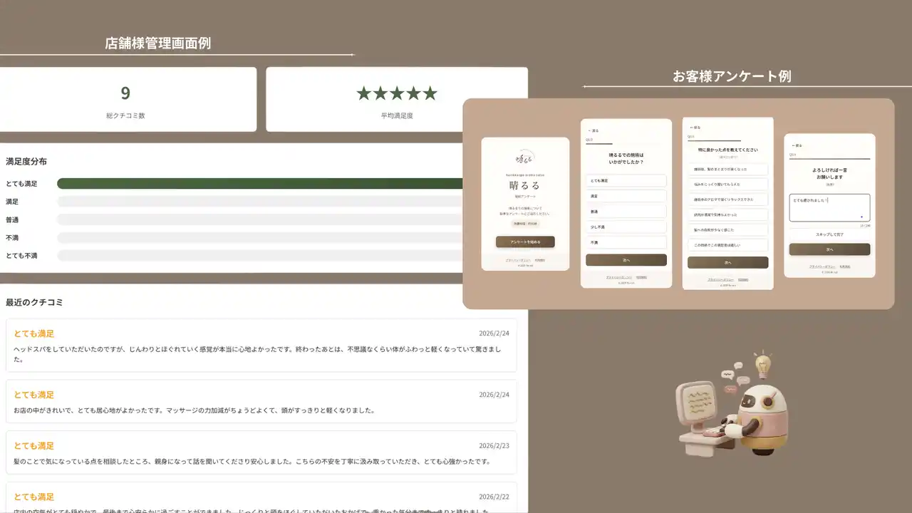 「無理にお願いしなくても、自然にクチコミが集まる」仕組みを、店舗の日常オペレーションに組み込む形で実現することが、このプロダクトのテーマです。現場経験とAI実装力を掛け合わせ、店舗・スタッフ・お客様の三者にとって負担のないクチコミ運用を目指しています。 |