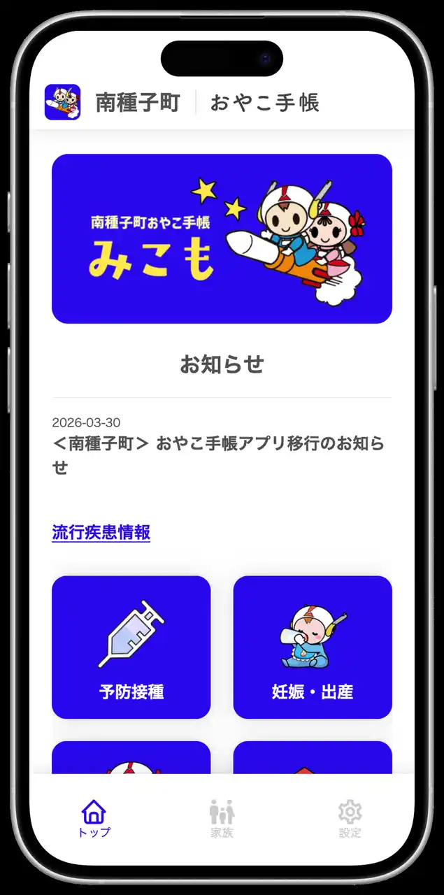 また 既存機能として、南種子町からのお知らせを月齢・年齢にあわせてタイムリーに受信できる「メール配信・プッシュ通知機能」、予防接種漏れや接種間隔ミスを防ぐことができる「予防接種スケジューラー」、成長グラフや乳幼児健診の記録など母子手帳の内容をマイページに記録できる「電子母子健康手帳 機能」なども 引き続きご利用いただけます。 |