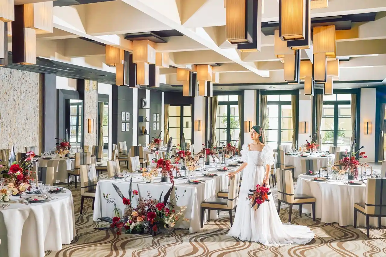 | モダンさと上品さを兼ね備えたラグジュアリーなパーティー会場は、ブラウンとアイボリーを基調とした落ち着いた空間が、大人のひとときを演出します。 | |||||||||