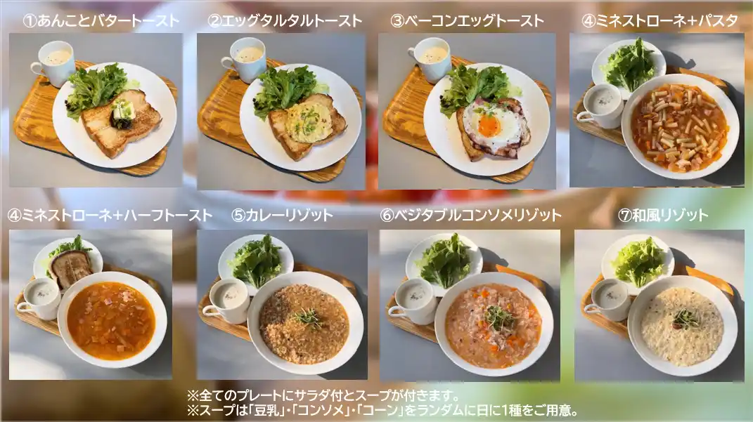 取り組んでおり、その取り組みの一環として、4月よりキャンパス内の「ロハスカフェ(有明)」および学生食堂(武蔵野)において、本学学生を対象とした「100円朝食プロジェクト」を開始します。本プロジェクトは物価高騰が続くなか、学生に対する経済的支援に加え、学生に朝食を取る習慣をつけてもらうことも目的として実施します。 |