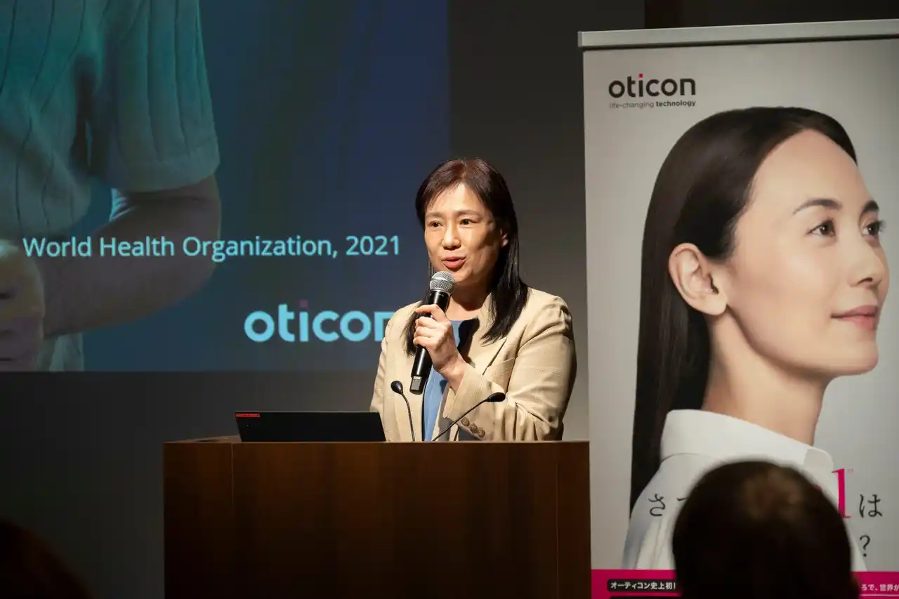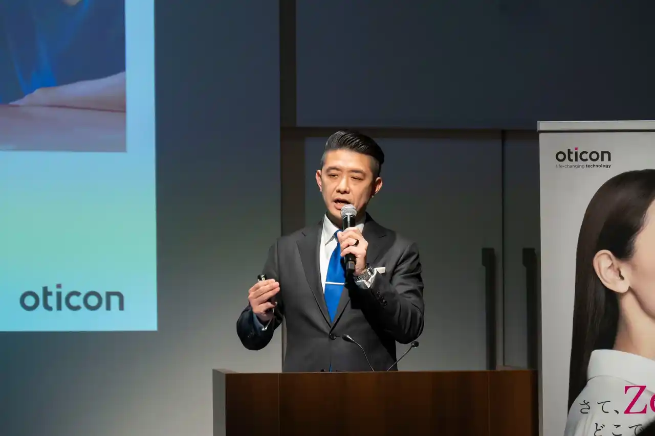 続いて、当社代表取締役社長の齋藤徹が登壇し、日本における難聴の現状や補聴器装用率(15.6%)の低さを示すとともに、補聴器装用が推奨される方であっても、スティグマにより装用をためらうケースが多い現状について言及しました。「ジール」は、こうした課題を克服するために開発された製品であり、製品名に込められた“強い熱意と使命感”には「聞こえの未来を変えていく」という「オーティコン」の決意が表れていると説明しました。 最後に「ジール」への期待と、補聴器市場拡大のゲームチェンジャーとなる製品であることを確信していると述べました。 |