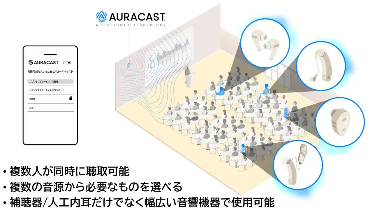 会場では「ジール」の試聴体験機会を提供し、参加メディアは次世代ワイヤレス通信「Auracast(TM)(オーラキャスト)」を通じて同時通訳音声を聴取しました。操作はスムーズに行われ、実際に装用した記者からは「自然な装用感で違和感がない」「非常に興味深い体験だった」など、ポジティブな評価が寄せられました。 |