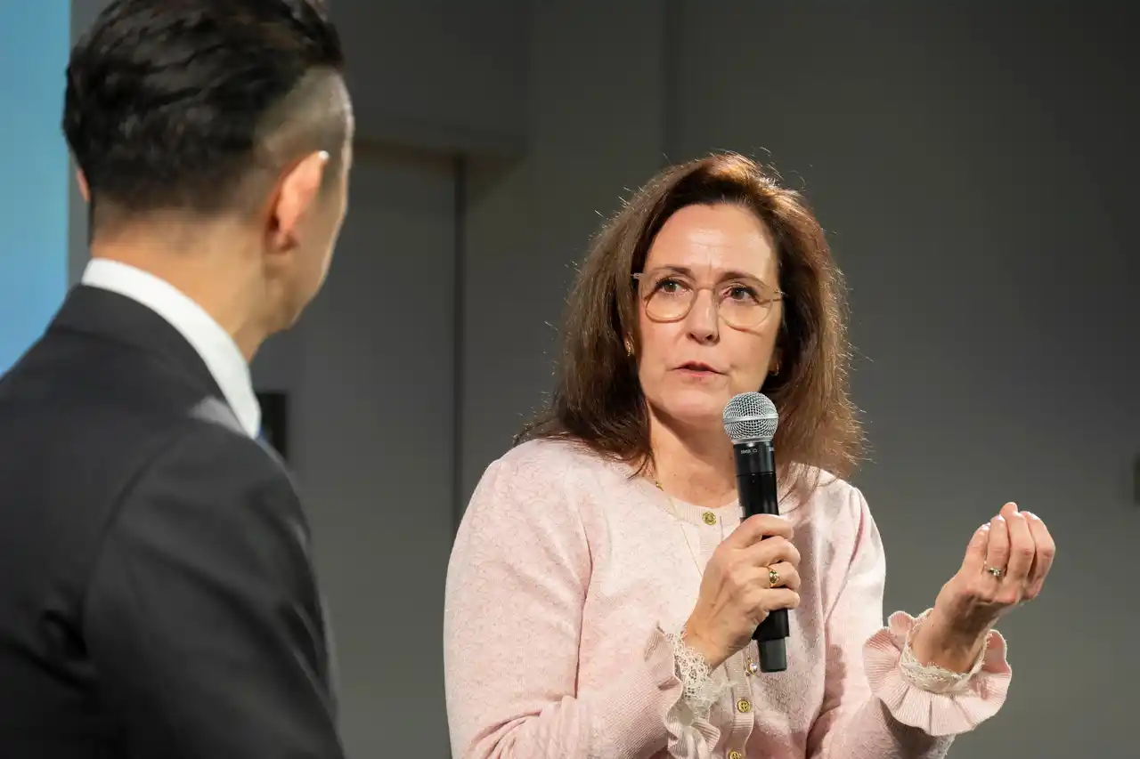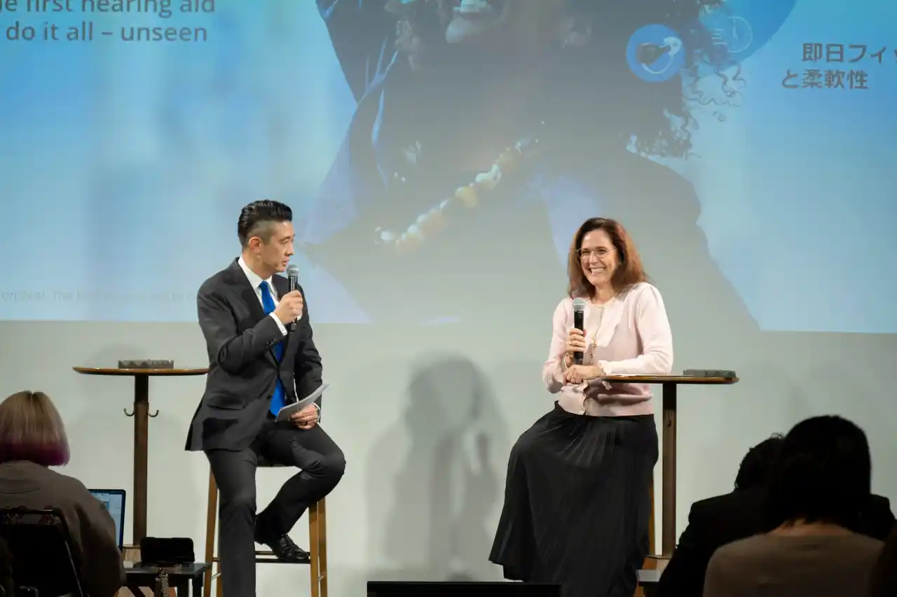また、デンマーク本社にてアジア地域のマーケティングを統括するコマーシャルディレクターのRikke Nielsen(リッケ・ニールセン)と当社代表取締役社長の齋藤徹によるトークセッションにおいて、リッケ・ニールセンから「ジール」の開発背景と約7年をかけて開発されたことが明かされました。さらに、海外では発売から約3か月で29,000件以上のフィッティング実績を有し、既存顧客の買い替えだけでなく、新しいユーザー層の獲得につながっており、特に若年層からの支持を得ている点を報告しました。齋藤からは補聴器装用率の向上に貢献する製品としての期待と、海外同様に日本でも「ジール」で市場そのものの拡大につなげたいとの意欲を示しました。 |