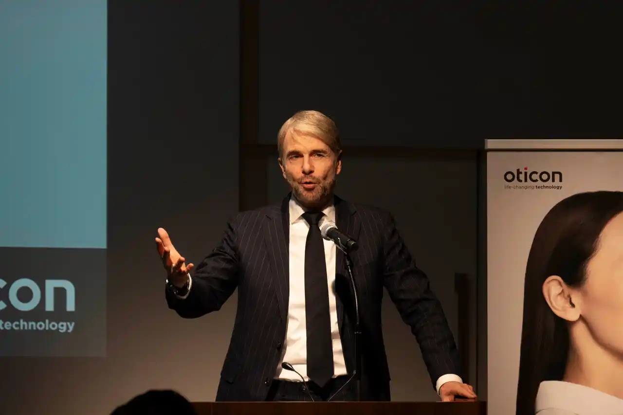 最初に、のヤール=フリース・マスン駐日デンマーク王国大使が登壇しました。挨拶の中で、ライフサイエンス分野がデンマークの経済成長を支える重要産業であり、デマントがその中核を担う企業の一つであると紹介しました。また、デマント・ジャパンが日本において50年以上にわたり事業を展開している点にも触れました。さらに、高齢化が進む現代において、健康寿命やキャリア寿命の延伸が国の経済にも影響を及ぼすことから、聴覚ケアの重要性が高まっていると述べました。