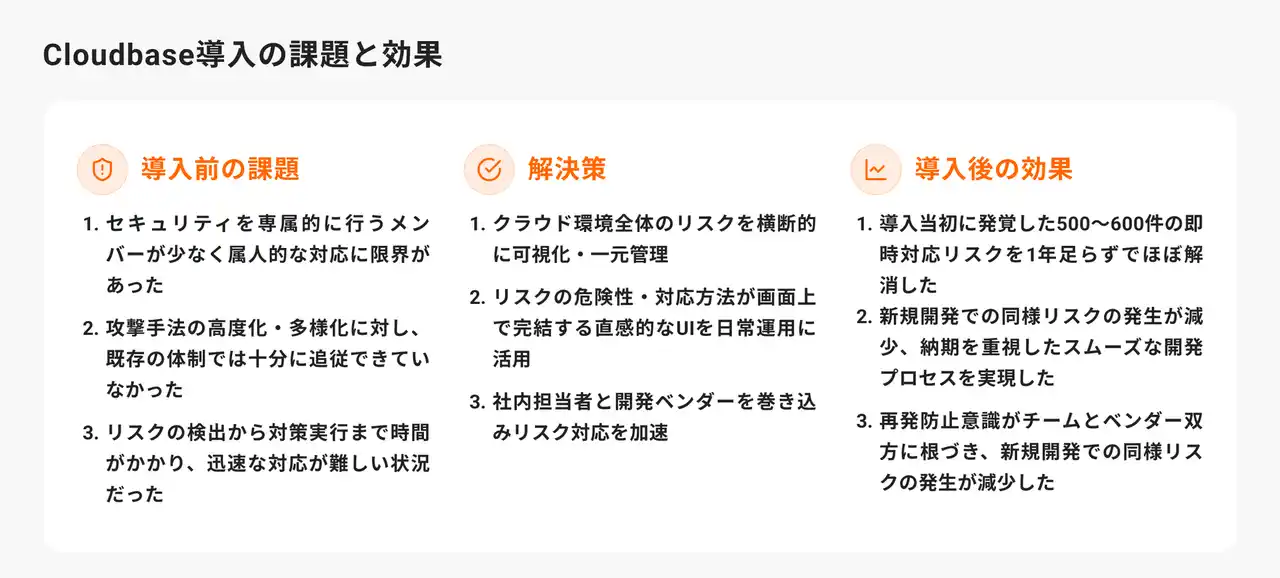 Cloudbaseの導入により、クラウド環境に存在していた500件以上のリスクを、1年足らずで解消することに成功しました。リスクの可視化と優先度に応じた対応により、限られたリソースでも効率的に是正を進められた点が大きな成果です。 |