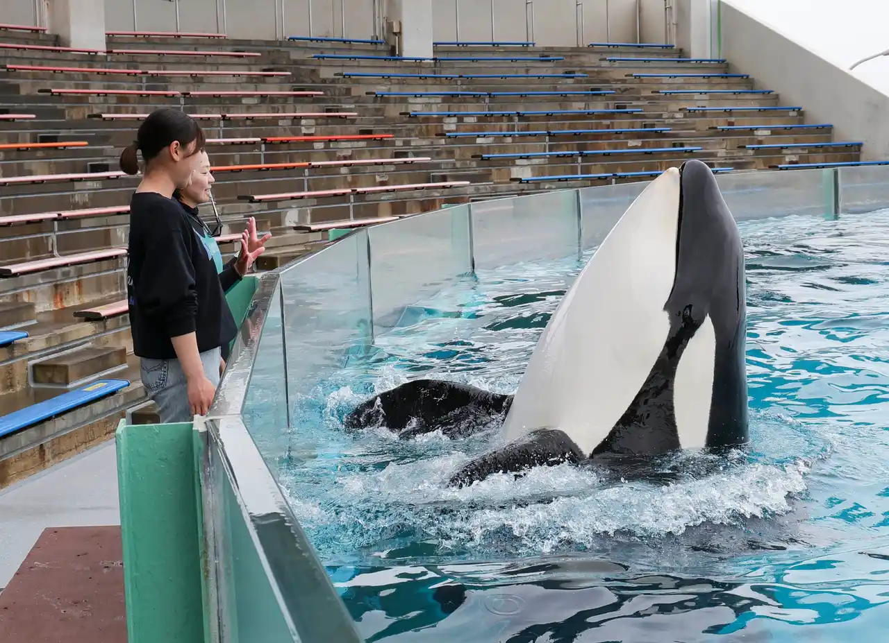 鴨川シーワールドならではの体験として、間近で観察できるほか、飼育員の説明を受けながらシャチとの握手を体験することができます。 |