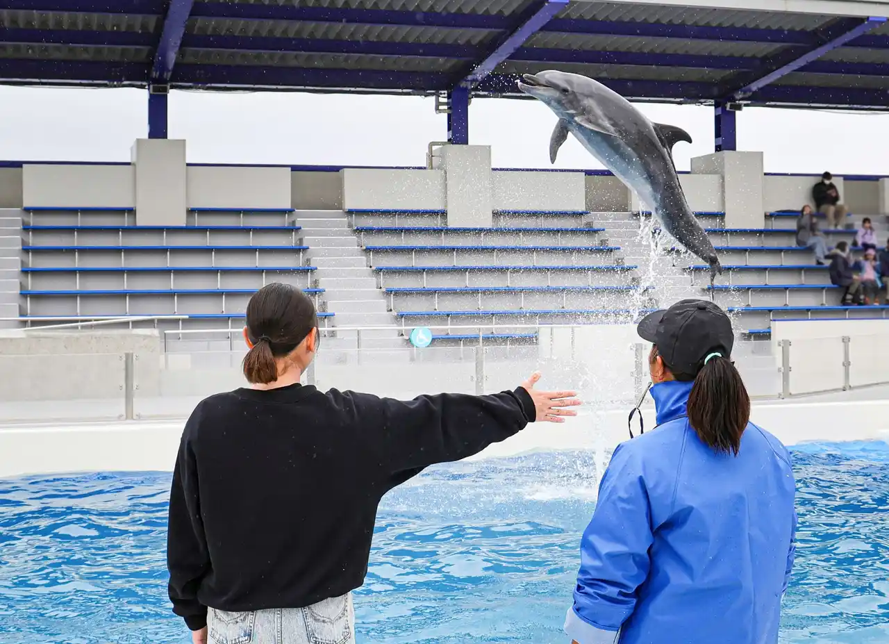 飼育員に教えてもらいながら、イルカとの握手体験やジャンプ、回転などのサインだしを体験できます。プランならではの距離感をお楽しみください。 |