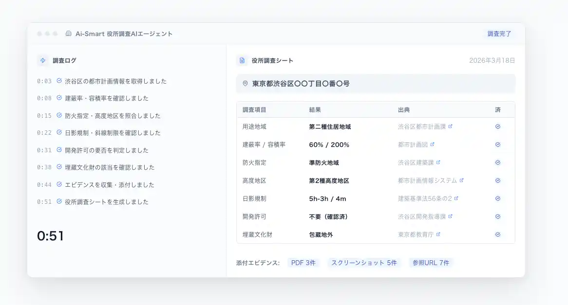 物件住所を入力するだけで、AIが自治体の公式WebGIS・公開資料・PDFなどから必要情報を収集し、役所調査レポートを自動生成。 |