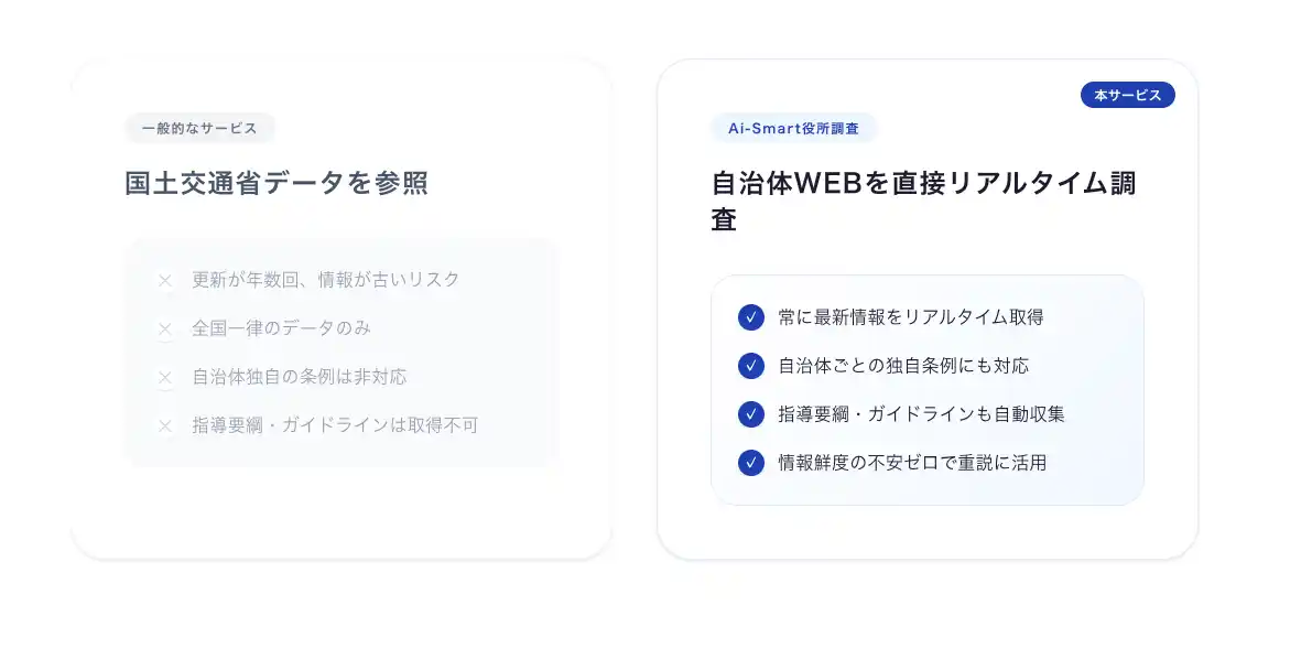 国土交通省のデータではなく、自治体WEBサイトから直接リアルタイムで情報を取得。常に最新の法規制・条例に基づいた調査を実現します。 |