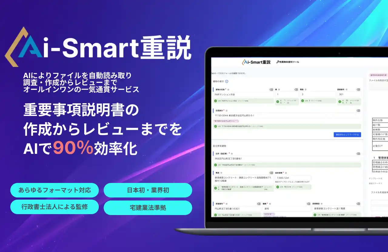 ※自社調べ(2025年10月時点)。日本国内で、区分所有物件の売買における重説作成をAIにより自動化できるシステムは当社が初となります |